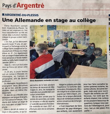 Grâce à ma famille, d’origine argentréenne de par ma mère, je connais déjà Argentré du Plessis comme ma poche ! Les établissements de la Salle St. Joseph d’ailleurs, je les ai découverts quand j’avais 15 ans, en participant à l’échange du collège St. Joseph avec la Canisiusschule de Ahaus, où j’étais élève (en classe 3ème). De plus, j’ai aussi fait un stage d’observation de 3 semaines à l’école maternelle la Salle St. Joseph en janvier 2014. Avec cette nouvelle immersion, je crois que je serais prête à enseigner ici tant j’ai été intégrée à tous les cycles en l’espace de 10 ans ! Une chance pour moi pour mon cursus universitaire actuel… Je vous retrouverai tous avec plaisir au printemps prochain pour une dernière session de 5 semaines, normalement en plein accueil des élèves allemands de la Canisiusschule et aussi du séjour des français à Ahaus ! La boucle sera bouclée ! BIS DANN ! Elena BUSSMANN.